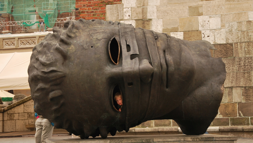 Al lado de esta torre se encuentra una de las esculturas más famosas de la ciudad, se trata de una cabeza tumbada obra del escultor polaco Igor Mitoraj, la escultura recibe el nombre de «Eros Bendato», se instaló allí para una exposición y después el autor la donó a la ciudad de Cracovia.
