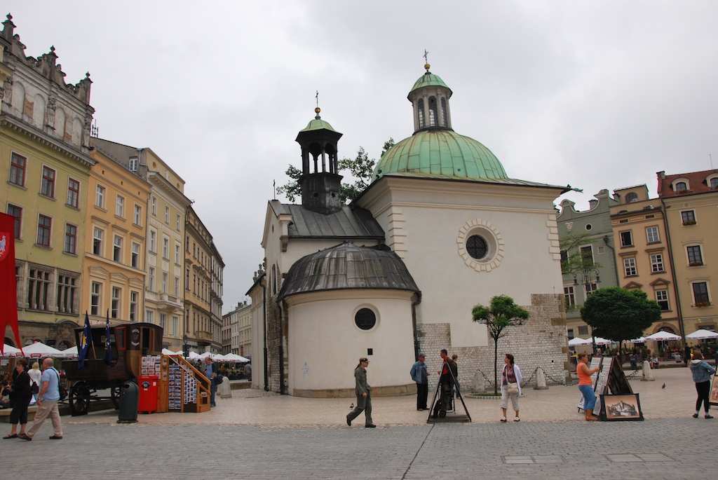 En la misma plaza y contrastando con esta iglesia barroca, se encuentra la Iglesia de San Andrés (por algo Cracovia es también llamada la ciudad de las 200 iglesias), una iglesia románica del siglo XI, siendo uno de los edificios más antiguos de la ciudad.