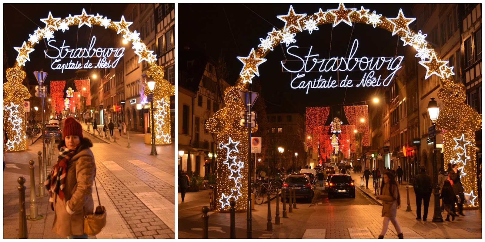 Para hacer tiempo fuimos un momento al hotel, ya que lo teníamos a un paso, y dimos una vuelta disfrutando de la decoración navideña con la iluminación, pasando por la Place Gutenberg hasta llegar al arco de luces que muestra a Estrasburgo como capital de la Navidad.