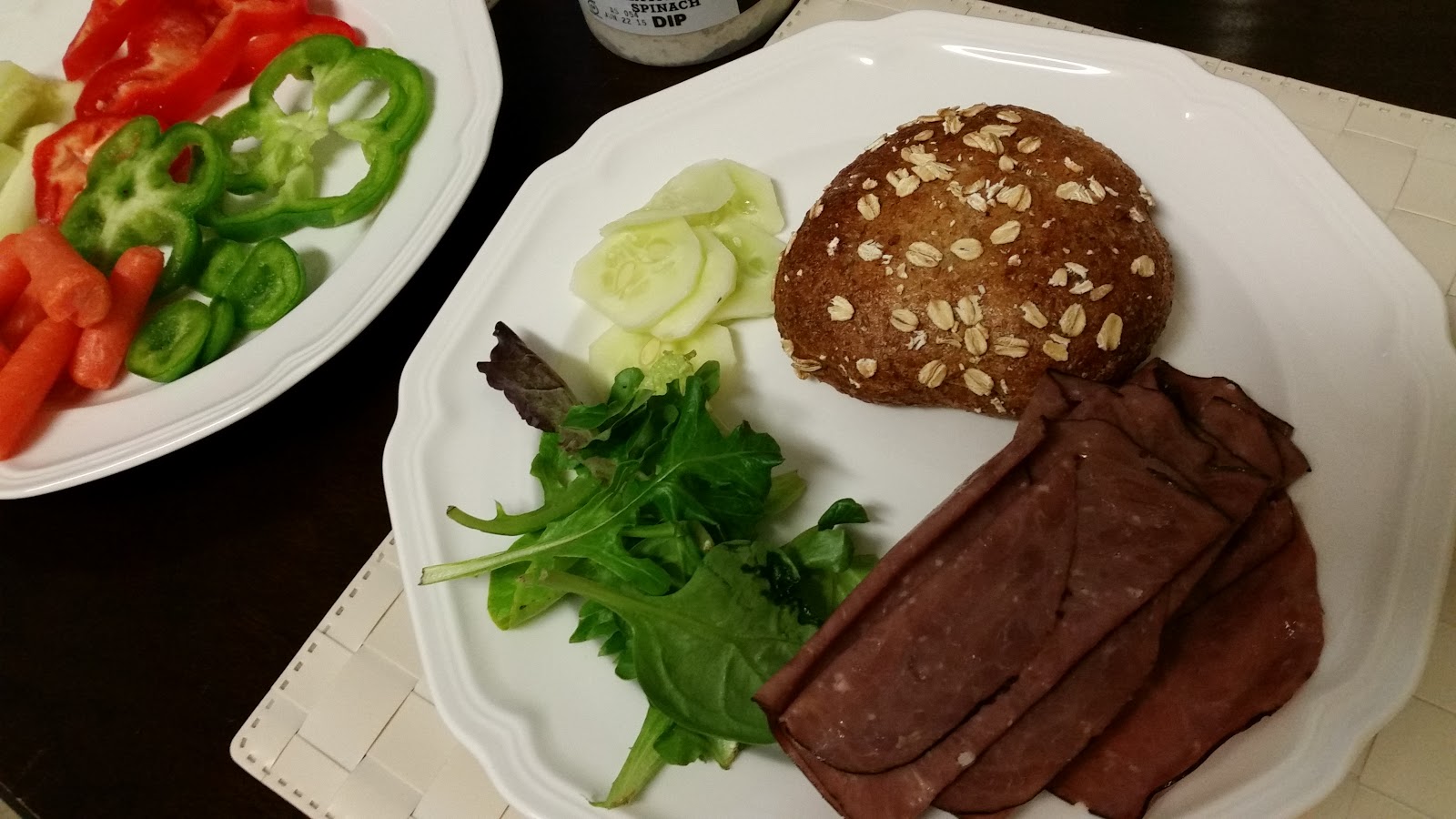 Antes de que cerrasen, hemos ido al Panera Bread a comprar dos bagels para preparar en casa para la cena. Las hemos rellenado de roast beef ylo hemos acompañado de unos crudites con crema de queso, alcachofas y espinacas.