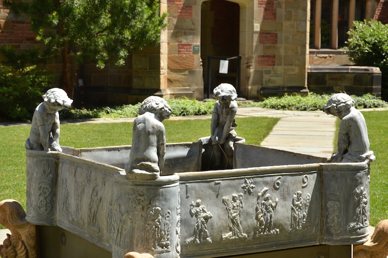Llegamos a uno de los iconos de la universidad, la Sterling Memorial Library, en la cual hay muchas esculturas que representan la historia de los Estados Unidos. En su patio interior se encuentra una preciosa fuente, con su construcción, el arquitecto quería equilibrar la solemnidad de la biblioteca con el espacio al aire libre.
