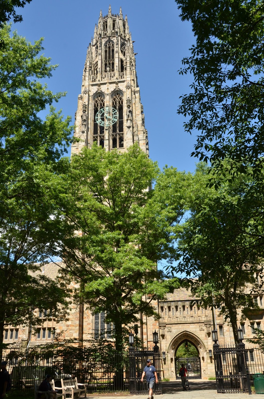 De allí, hemos continuado hasta el Old Campus, justo enfrente de la Harkness Tower, en la cual pueden observarse diferentes esculturas a diferentes niveles de la misma. Alrededor de su reloj, se encuentran los ocho grandes hombres de la universidad de Yale en actitud vigilante de cuanto acontece en la vida académica. El arquitecto James Gamble Rogers también añadió varias imágenes de la vida del estudiante.