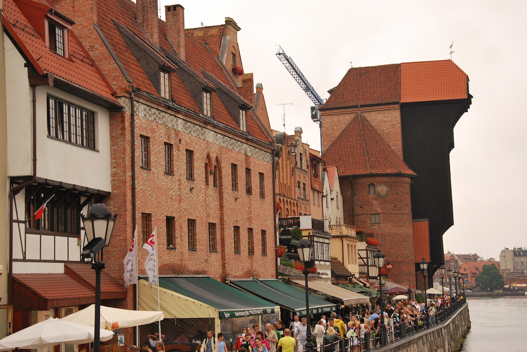 Aunque sin duda el edificio más famoso de la ciudad, y por el que es más conocido, es la Grúa, Zuraw Gdanski. Fue construida en el siglo XV y restaurada siguiendo la imagen de antaño después de la Segunda Guerra Mundial. Tiene una estructura de madera con dos torres semicirculares de ladrillo. En su momento se usaba para cargar y descargar los barcos atracados en el muelle y gracias a la fuerza de los operarios que trabajan allí, lograba alzar hasta dos mil kilos, convirtiéndose en la más eficaz y potente de su época.