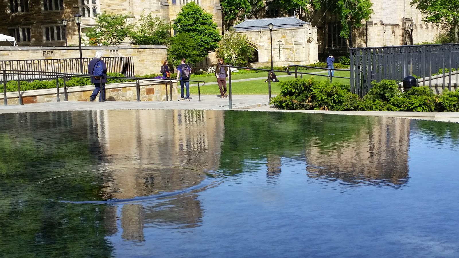 Cuando llegamos a New Haven, una zona del Cross Campus, nuestro green Sterling, estaba cubierta por obras, lo que estaban construyendo es una gran fuente de piedra oscura muy original, en ella se puede ver el reflejo del Berkeley College. Alguien dejó olvidadas allí unas llaves y otra persona, que las encontró, dejó un mensaje en una tarjeta…Allí he estado sentada un ratito haciendo un skype con mi familia!!!