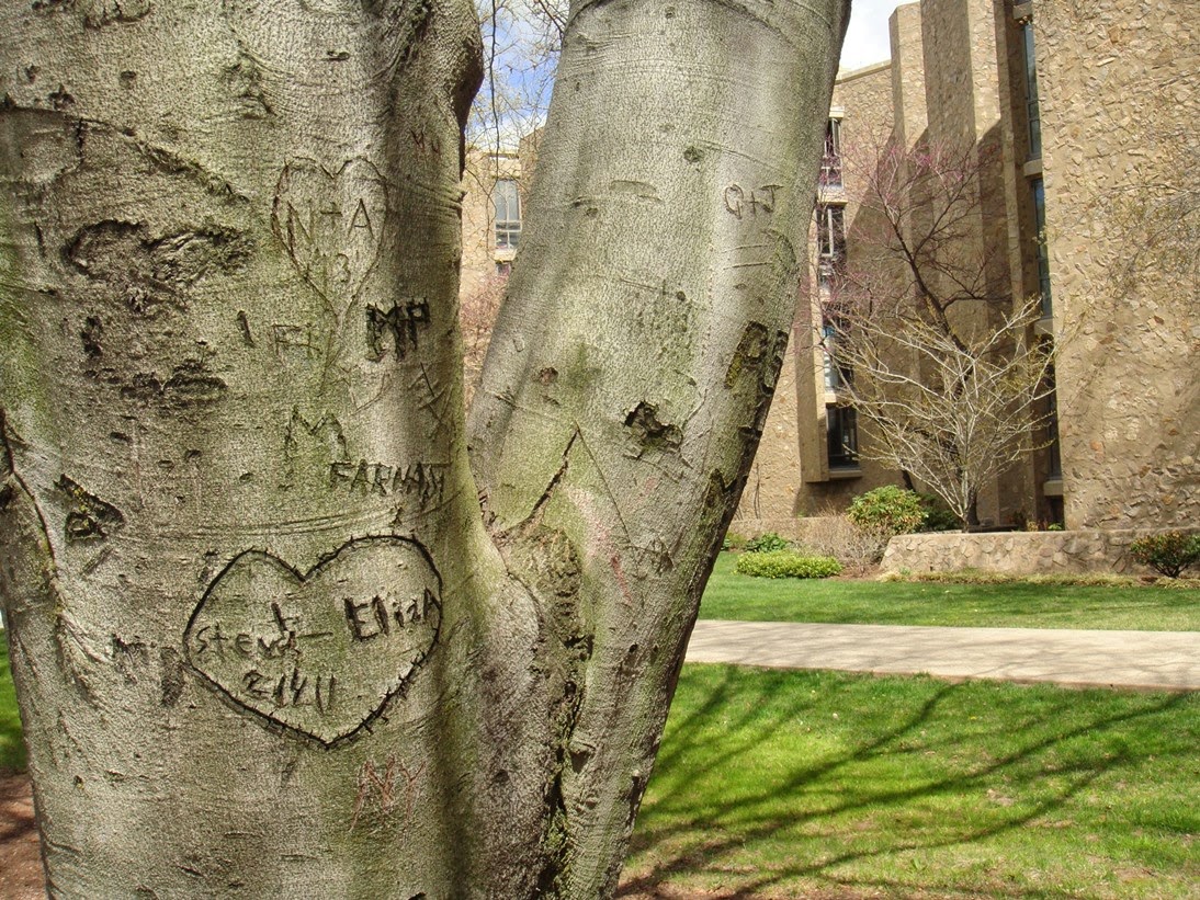 Hago unas cuantas fotos y me salgo del recinto. Ya fuera del college, hay un árbol marcado con corazones y nombres que será testigo de muchos amores y desamores a lo largo de los años.