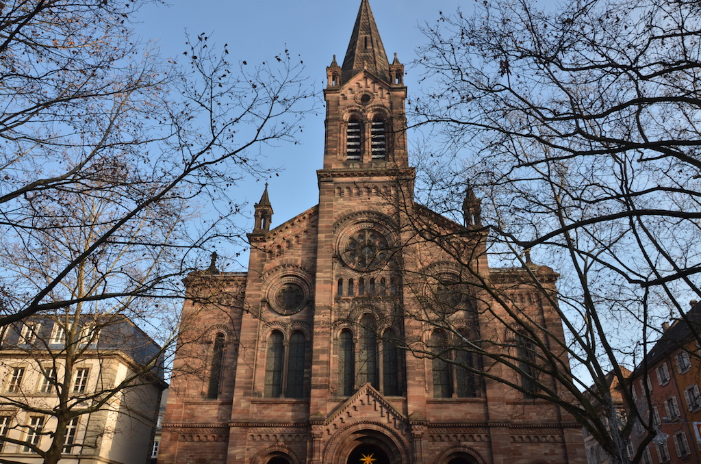 Nos desviamos hacia el interior nuevamente a la altura de la Iglesia de Saint Thomas, una iglesia consagrada al culto protestante, un bello ejemplo de gótico alsaciano.