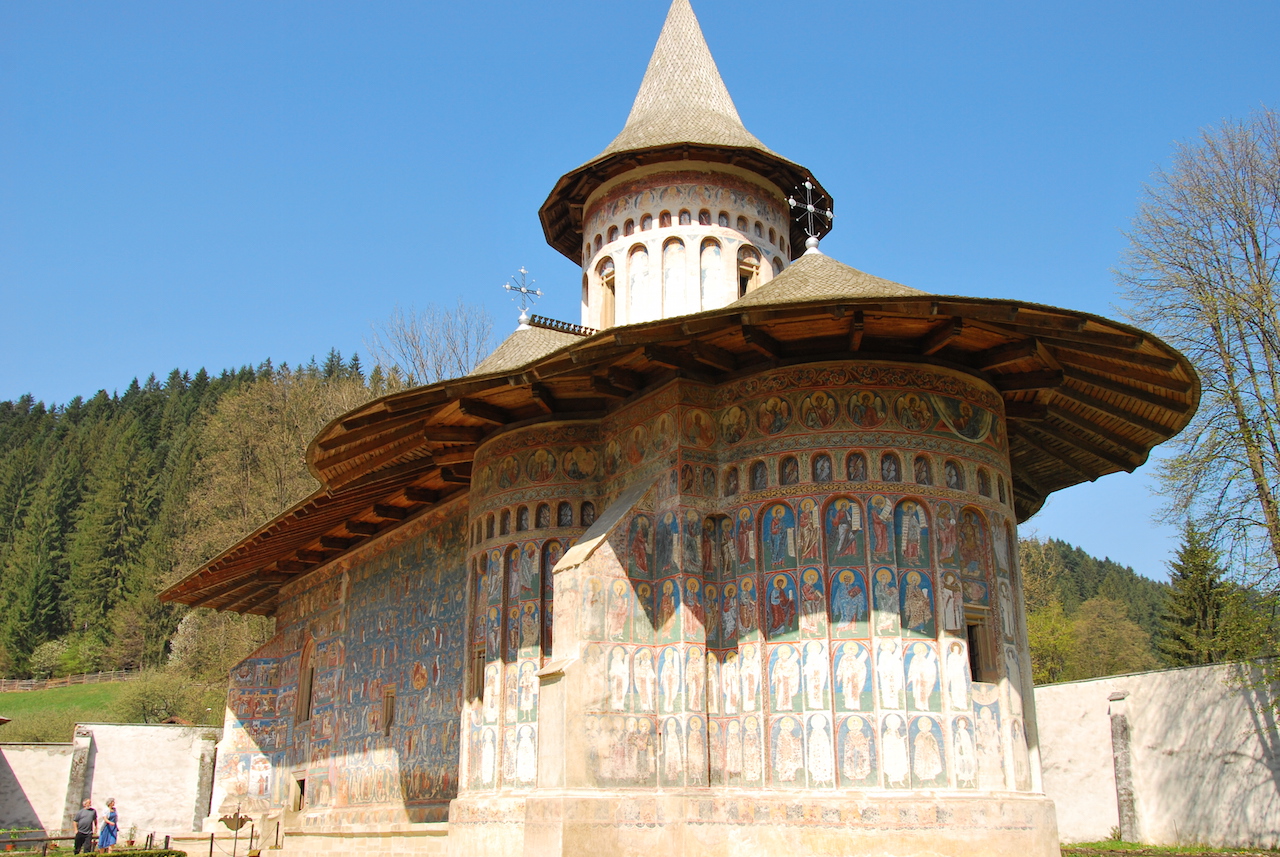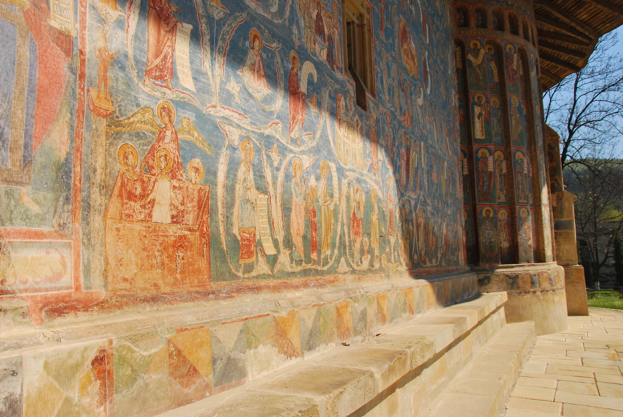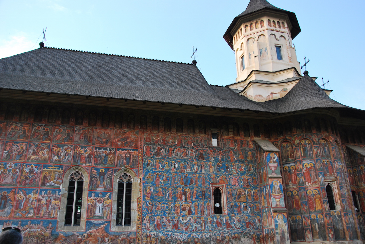 Salimos temprano de Bacau y el primer monasterio que visitamos fue el Monasterio de Voronet, todavía en activo, es uno de los ejemplos más claros del estilo moldavo. Es el más famoso de la región, erigido en 1488  en honor a San Jorge, posee unos tejados de madera bastante inclinados para proteger de la nieve y el agua las paredes exteriores que es donde se encuentran las pinturas más importantes.
