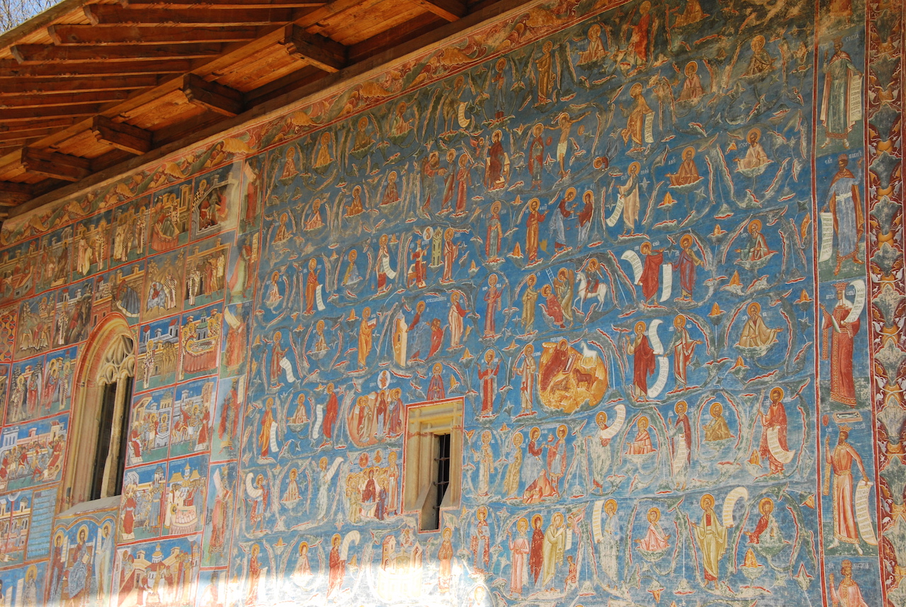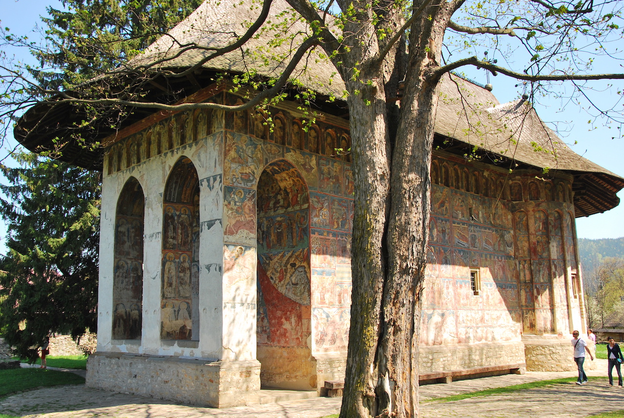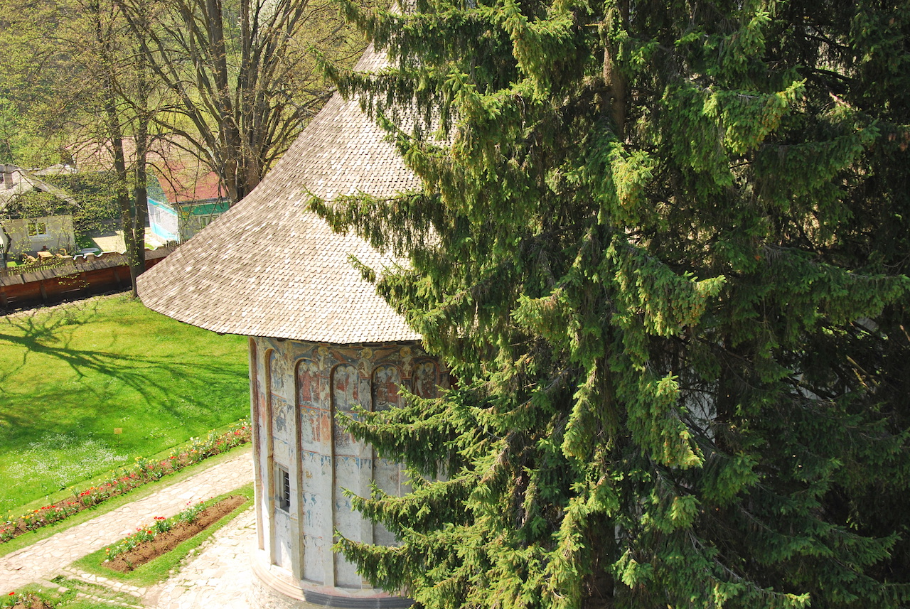 Salimos temprano de Bacau y el primer monasterio que visitamos fue el Monasterio de Voronet, todavía en activo, es uno de los ejemplos más claros del estilo moldavo. Es el más famoso de la región, erigido en 1488  en honor a San Jorge, posee unos tejados de madera bastante inclinados para proteger de la nieve y el agua las paredes exteriores que es donde se encuentran las pinturas más importantes.