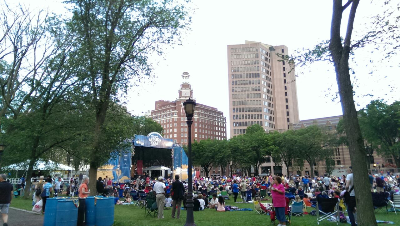 A media tarde nos hemos ido a dar un paseo y ver el ambiente que había por el Green ya que se está celebrando el International Festival of Art & Ideas. A las 7pm hay programado un concierto de Angélique Kidjo, ganadora este año del Gramy a mejor álbum de de música del mundo, y allí nos quedamos un rato hasta que comienza a llover y tenemos que ir a refugiarnos hasta el edificio del Bank of America que hay al lado del ayuntamiento.