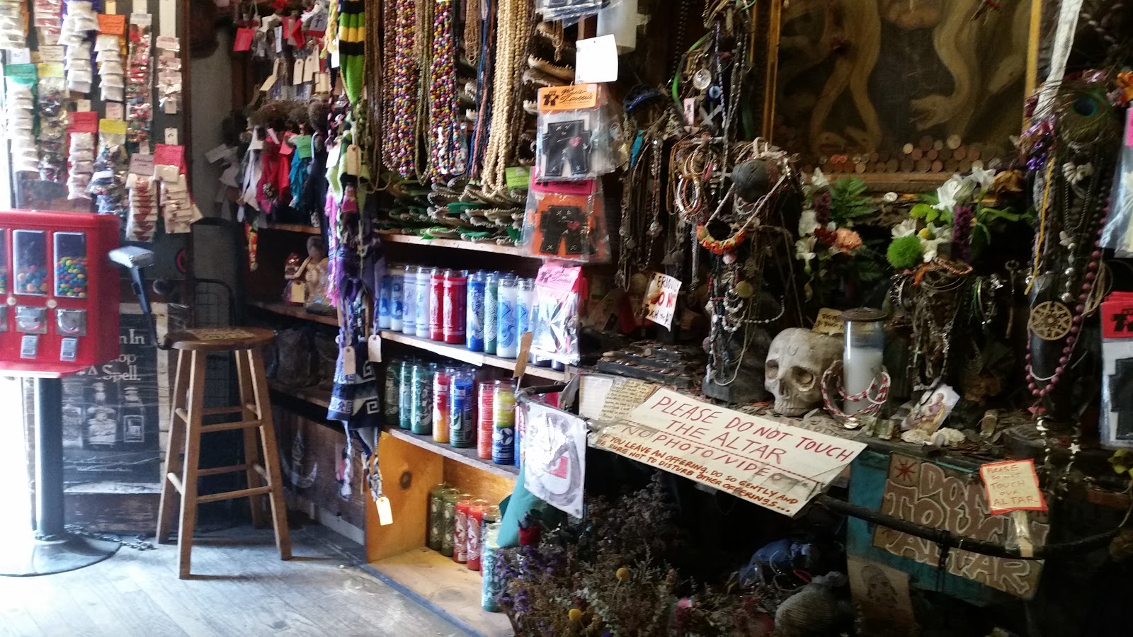 En en 739 de Bourbon St se encuentra una tienda llamada “Marie Laveau’s House of Vodoo”, un lugar dedicado única y exclusivamente a la venta de objetos relacionados con el vodoo. Nada más pasar a la tienda ya da un poco de miedito, un altar con una fotografía de la Reina del Vodoo, Marie Laveau, y cientos de objetos que la gente ha ido depositando junto a ella, dinero, rosarios, estampas, fotos, etc…. todo con una capa de polvo que lo hace aún un poco más siniestro si cabe. La dependienta no podía ser más adecuada para ese lugar, con un aspecto siniestro colocada tras un pequeño mostrador lleno de muñecos de vodoo, cruces, etc, observo un poco y enseguida me voy, la verdad es que no tengo ningún interés en hacerme con un souvenir de la tienda.