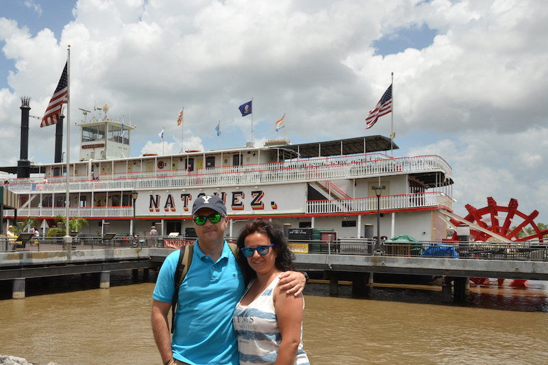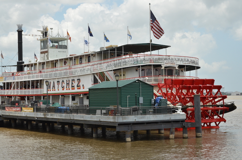 Salimos del hotel y por suerte cogemos el tranvía que nos deja en el acuario de la ciudad, bastante cerca del lugar desde el cual sale nuestro barco, el Natchez, uno de los pocos barcos de vapor que siguen surcando las aguas del Mississippi. Curiosamente, al lado del puesto donde canjeamos nuestra reserva, se encuentra el personaje que he visto por la mañana en el French Quarter, con su traje blanco y su sombrero de copa sorprendiendo a todos los turistas.