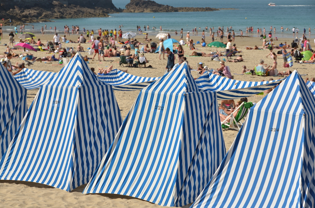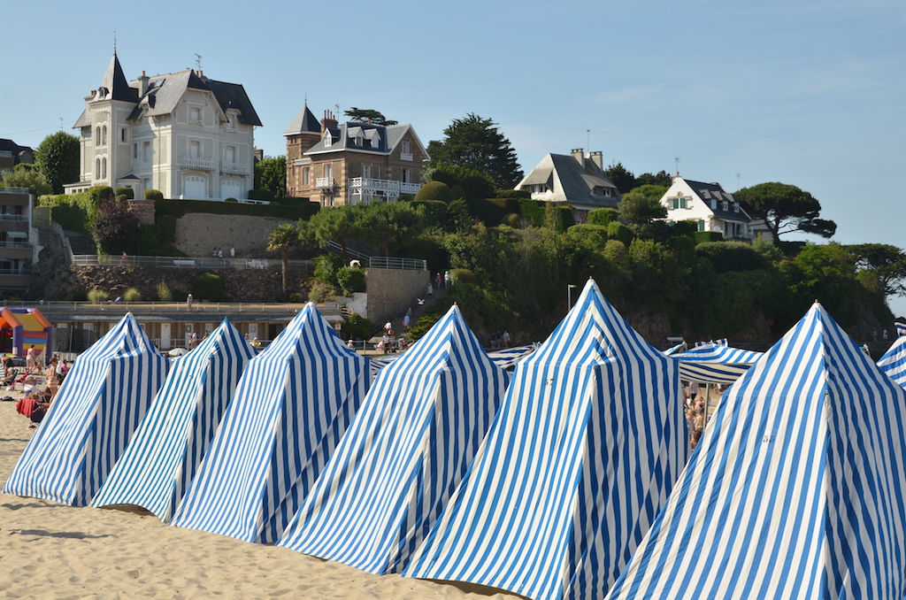 Ya en la ciudad de Dinard, nos vamos a disfrutar de su ambiente de playa, una playa en la que encontramos unas casetas de lona de rayas azules que le dan un encanto especial. Bañarnos no nos bañamos, tampoco íbamos preparados para ello, pero sí que nos mojamos un poco los pies!!!