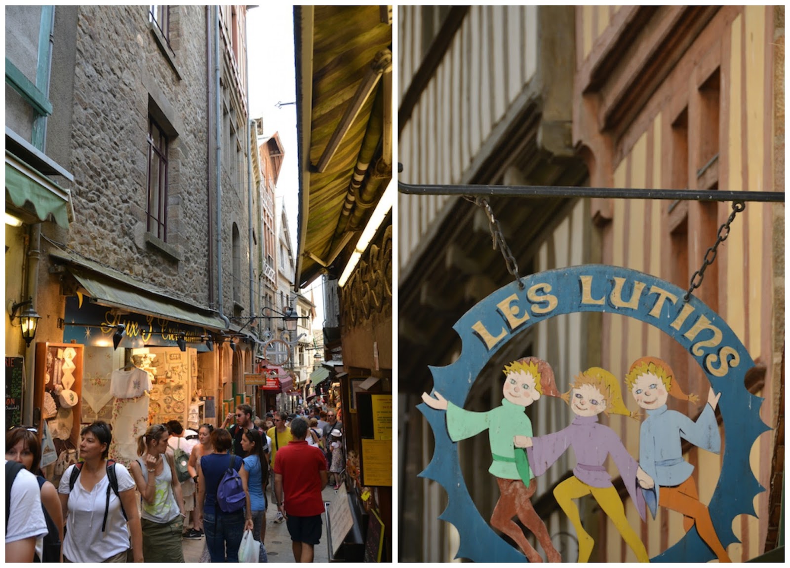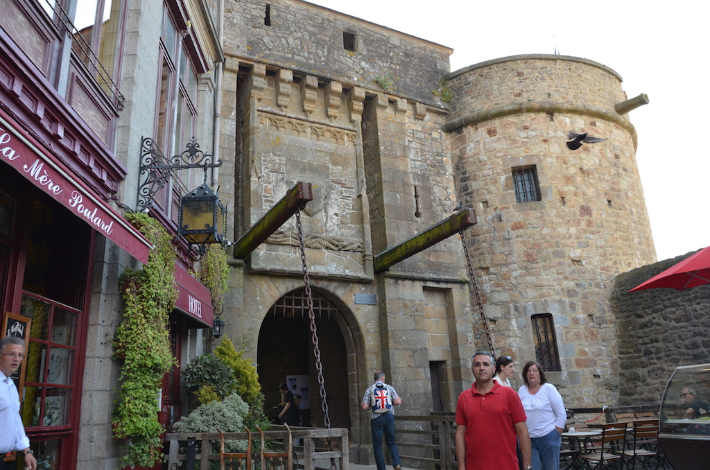 Entramos al recinto por la puerta Bavole y continuamos por la calle principal, aún se podía caminar bien y no había grandes masas de turistas. Hay que tener en cuenta que allí viven de forma permanente sólo 40 personas, de los que más de un cuarto son monjes y monjas, pero en un sólo día, el Mont Saint Michel puede albergar a más de 20.000 turistas, así que podéis haceros una idea de lo que puede ser su calle principal en «hora punta».
