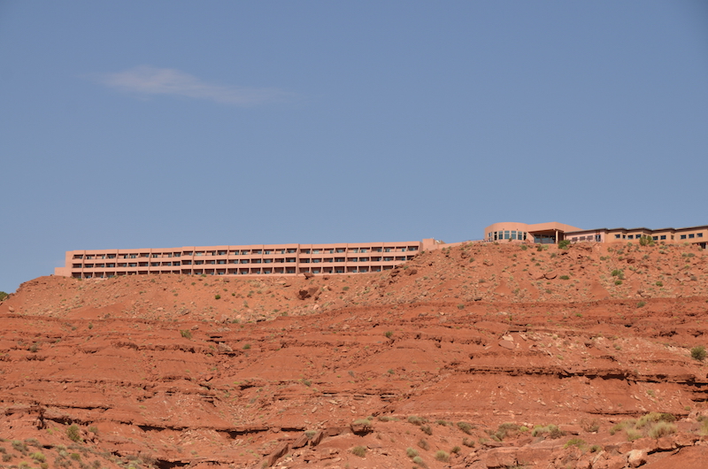 Desde algunas zonas del recorrido puede verse el hotel, aunque está bastante integrado con el paisaje y no han creado una gran mole impactante, el hotel tiene sus detractores que opinan que nunca tenía que haberse construido allí.