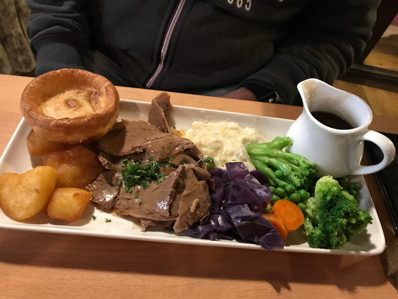 Todavía con la emoción de las vistas nos fuimos a comer el tradicional asado de los domingos, el Roasbeef que preparan en la mayoría de los pubs de la ciudad y del país. Nosotros elegimos el White Horse Pub y nos gustó bastante, tomamos unas cervezas locales, un entrante de queso camembert y un roastbeef para compartir.