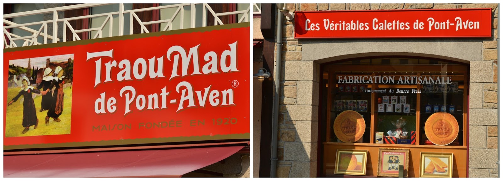 Otra de las cosas que hace famosa a esta localidad son sus galletas Traou Mad, unas riquísimas galletas de mantequilla. Hay varios lugares en Pont-Aven donde las elaboran y venden, nosotros compramos alguna cajita para traer como souvenir y una lata llena de galletas que ahora forma parte de nuestra colección de latitas (sí, tengo una pequeña colección de latas de diferentes lugares a los que hemos viajado, casi siempre vienen con té o galletas y una vez que nos lo comemos, nos sirven de decoración).