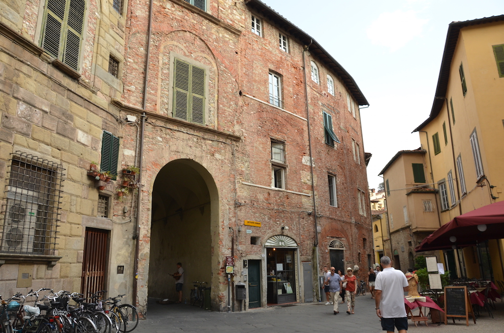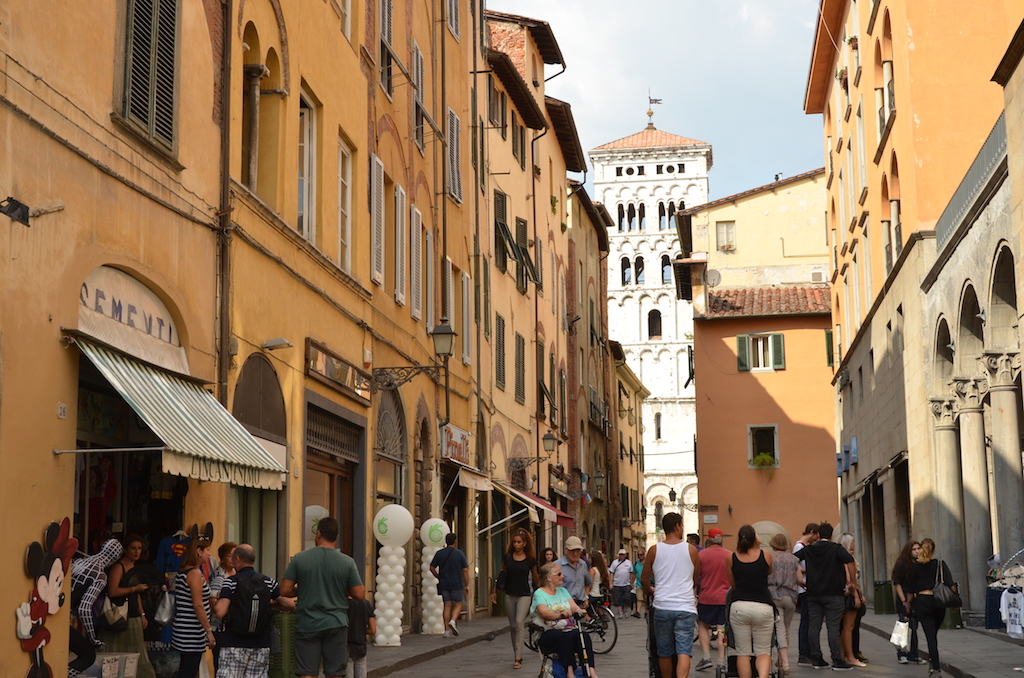 Llegamos a Lucca a la hora de comer, así que aparcamos nuestro coche en un parking y nos adentramos en el centro histórico para buscar un sitio para comer. Enseguida nos dimos cuenta de que era una ciudad que nos iba a gustar mucho, una ciudad con calles típicas italianas, con sus fachadas en color ocre, tiendas que parecen haberse estancado en el tiempo….