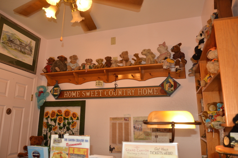 Nosotros nos alojamos en el Canyon Country Inn, situado en una típica casa de madera. El hotel está bastante bien, suficiente para pasar una noche, no una noche cualquiera si no la previa a la visita a uno de los puntos fuertes de nuestro viaje, el Gran Cañón del Colorado, por eso Williams es conocido como «La puerta del Gran Cañón». Me hizo gracia la decoración con ositos de peluche en las habitaciones y en la recepción, en la cual nos trataron amablemente como en todos los lugares en los que nos hemos alojado.