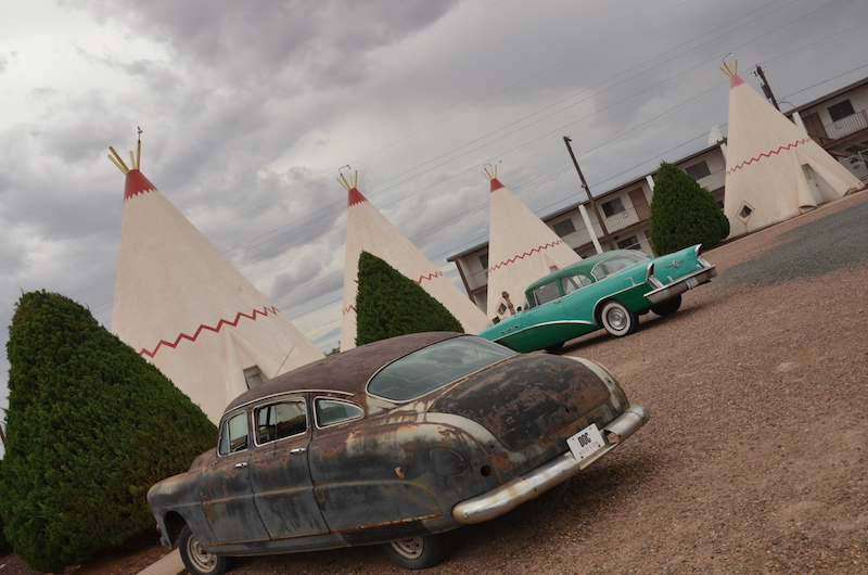 Salimos del Parque y llegamos a Holbrook, donde se encuentra uno de los hoteles «Wigwam Motel» con las habitaciones en forma de tipi. Hay varios a lo largo de la Ruta 66, pero creo que este es el más famoso. Entre las habitaciones hay también una colección de vehículos antiguos que hacen las delicias de los clientes y de los visitantes que nos acercamos hasta allí, la verdad es que hubiese estado muy bien poder alojarse en él, pero cuando planificamos el viaje ya no tenía disponibilidad, además de que suponía hacer algunos cambios en el itinerario.