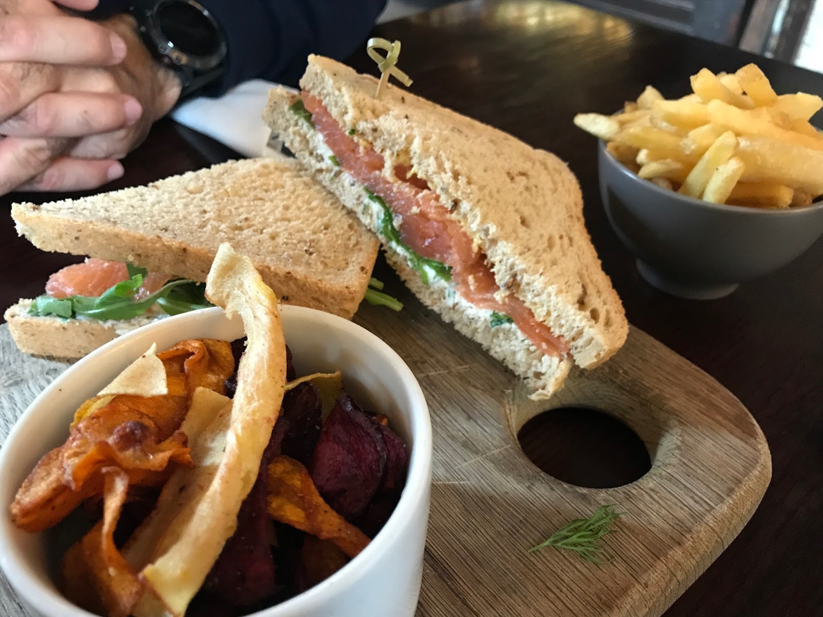 Pedimos dos cervezas y un sándwich de salmón para compartir, preferíamos no perder mucho tiempo en comer, en estas rutas nuestra comida principal es la cena jejeje.