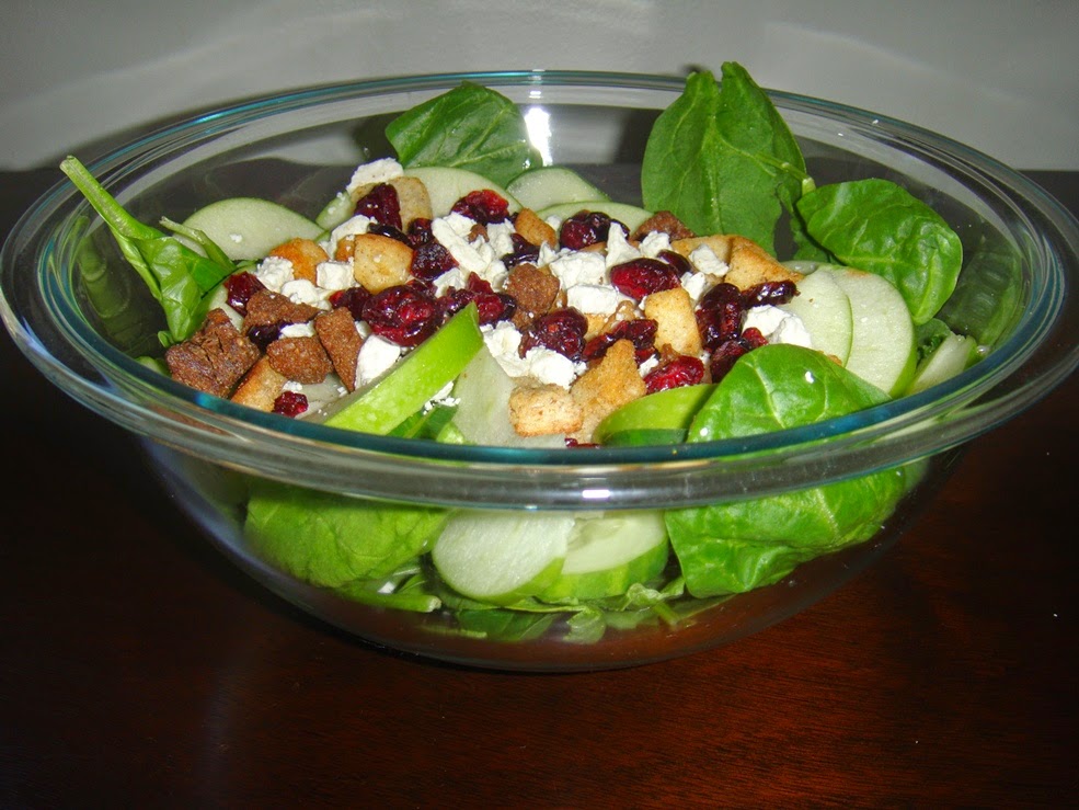 Para comer he preparado una ensalada parecida a la que cenamos la otra noche en el Maison Mathis, a partir de ahora la bautizaré como «ensalada Mathis», como está muy rica seguro que la prepararé más veces. LLeva espinacas frescas, pepino, manzana verde, queso feta, frambuesas secas y croutons, aliñado con nuestro aceite de oliva virgen y una cucharada de vinagre.