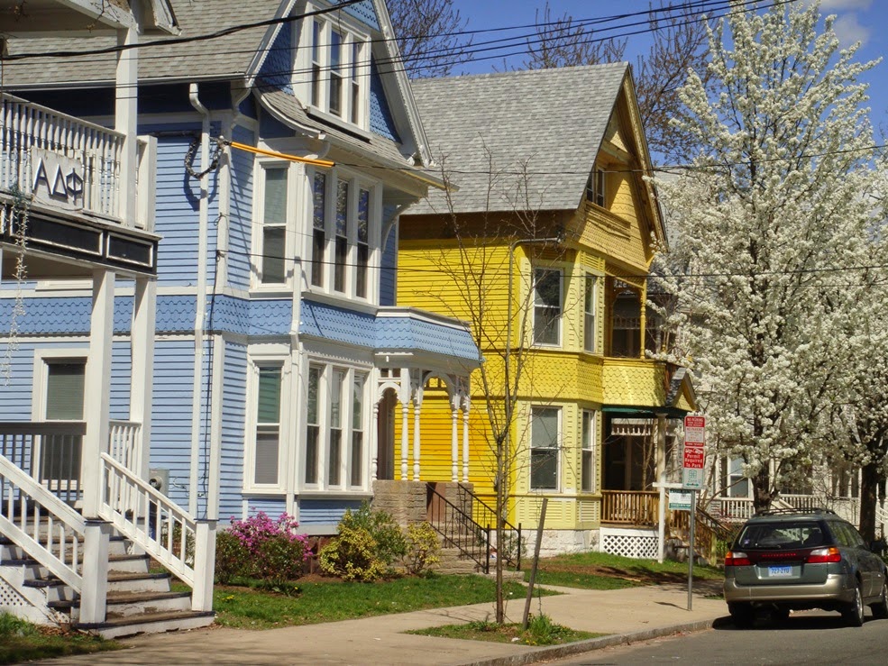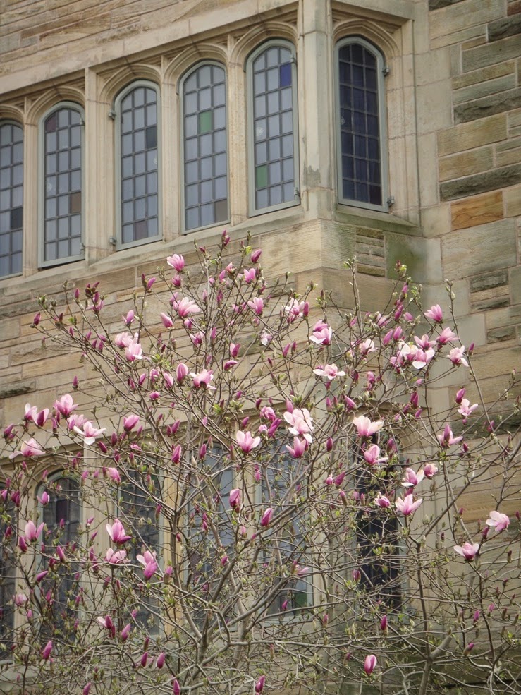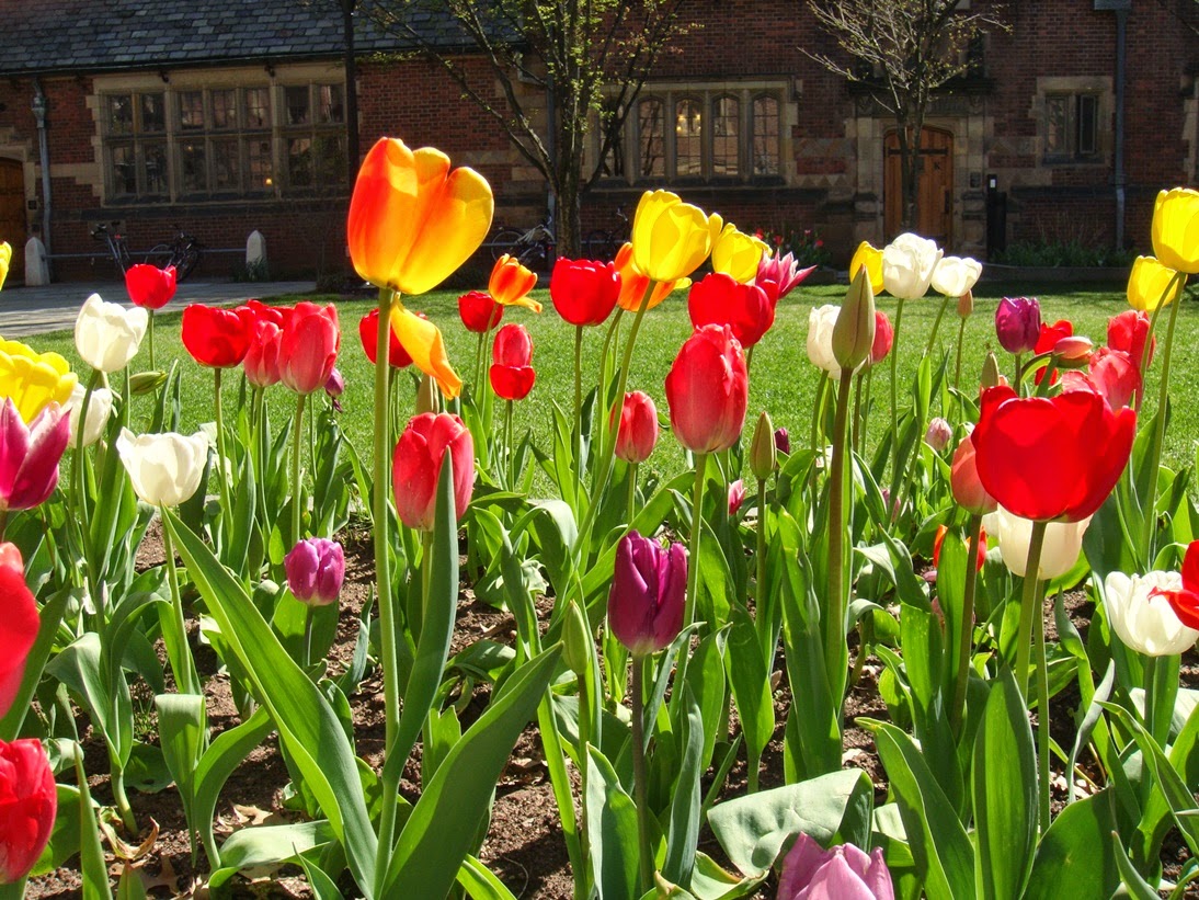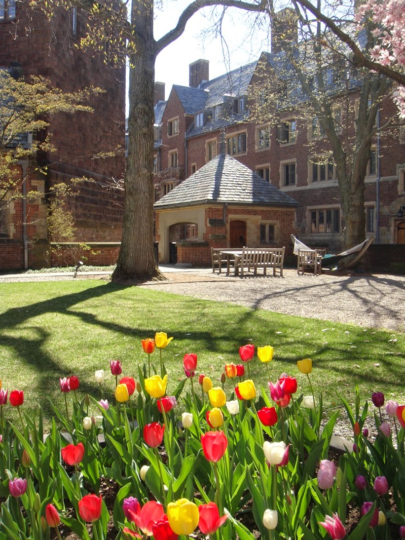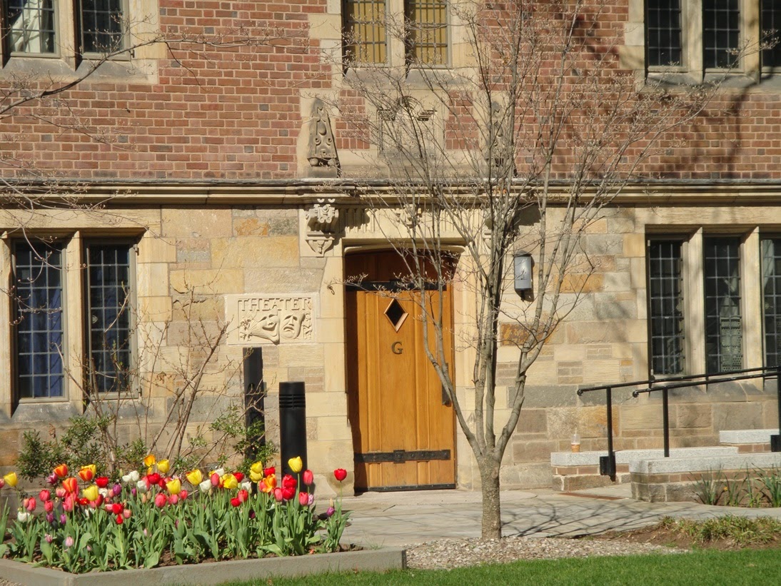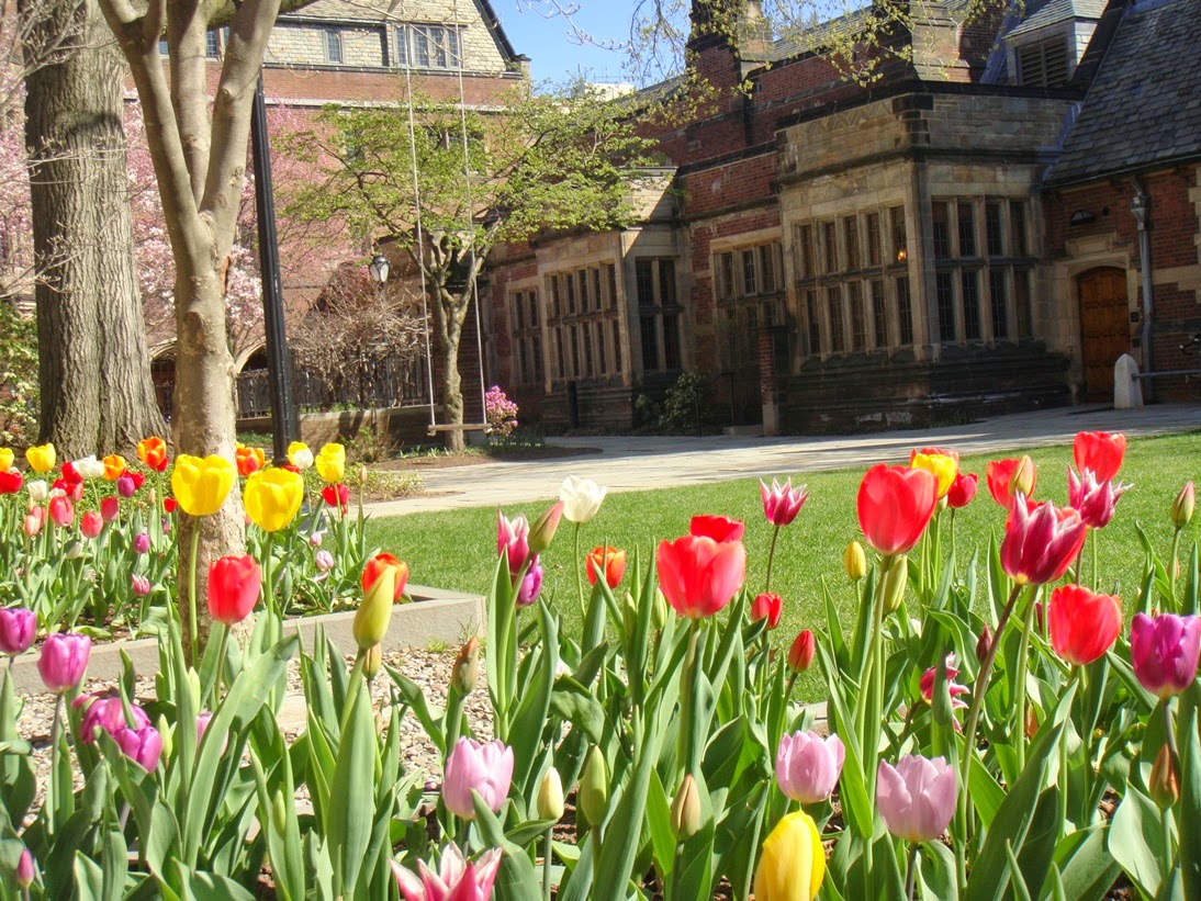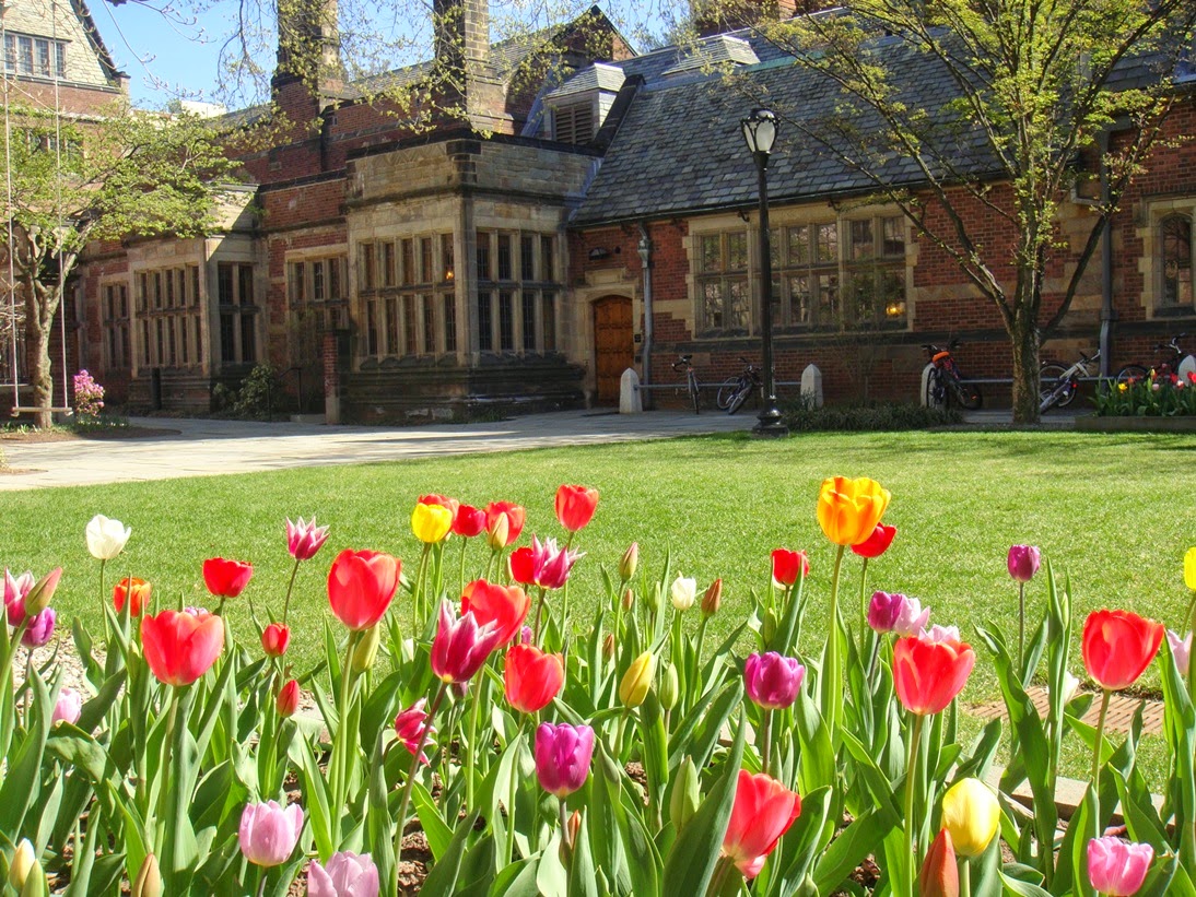 Cuando he salido me he ido en dirección al Old Campus con la intención de entrar a ver otro, cuando me estaba acercando al Jonathan Edwards College, he visto que había un grupo de estudiantes en la puerta y que ésta estaba abierta, no he tenido que hacer nada, sólo entrar….. Este es también bastante espectacular, y aquí los tulipanes estaban en su mejor momento!!!! Madre mía que cosa más bonita….