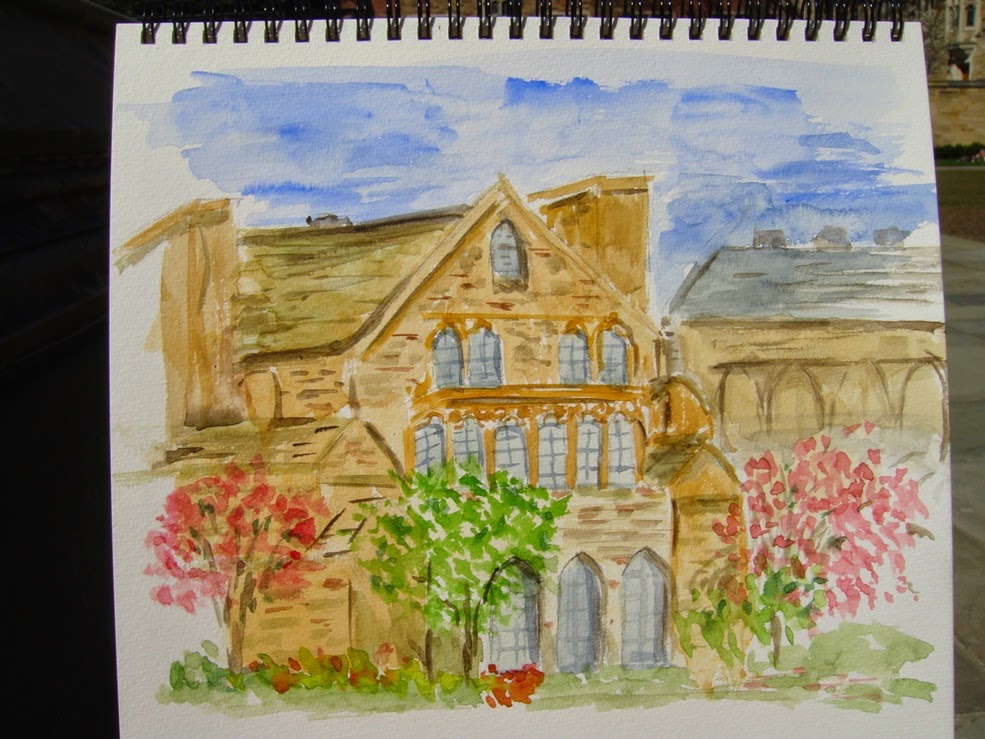Aprovechando la buena tarde que hacía, me ido a buscar un sitio donde pintar un rato, he pintado una acuarela de uno de los rincones de Yale, quizás haga unas cuantas de diferentes rincones para tenerlas como recuerdo.