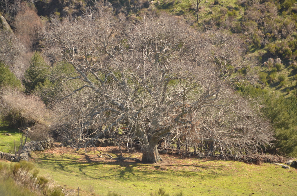 Siguiendo la pista encontramos una bifurcación, nosotros seguimos el camino que continúa por la izquierda, disfrutando del paisaje y nos encontramos con un símbolo de la zona, el Castaño del Cardoso, un árbol singular y especial por su tamaño, un porte de árbol perfecto que aún en invierno, sin hojas ni frutos, luce espectacular.