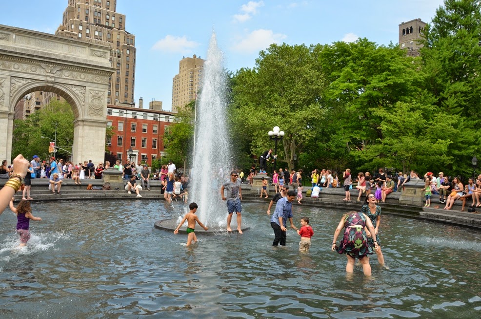 Llegamos a uno de los parques más animados de la ciudad, el Washington Square Park, en el que se encuentra el Washington Arch, jugadores de ajedrez y una gran fuente en la que dado el calor que hacía había bastante gente bañándose.