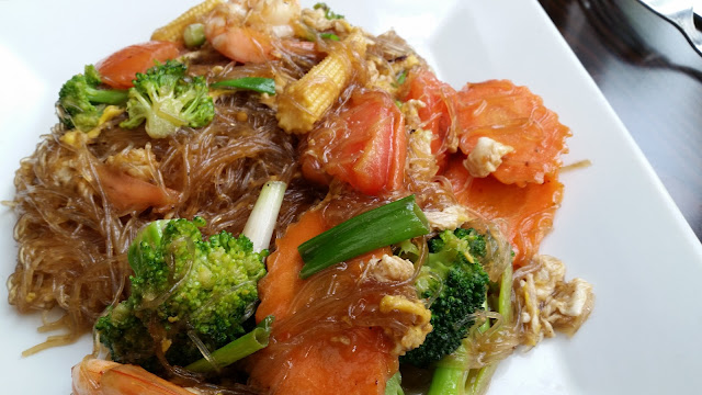 Hoy hace ya dos meses que estamos en New Haven, cómo pasa el tiempo!!! igual que el primer día, hoy hemos ido al Bangkok Gardens, un lugar muy agradable para comer y que además hacen descuento con la Yale ID, hemos pedido un plato de noodles con gambas y uno de arroz y ambos estaban buenísmos. El restaurante cuenta con una terraza acristalada, hoy estaba lloviendo y podías oir la lluvia en los cristales del techo mientras comías…. Antes del plato principal, siempre te sirven una pequeña ensalada.