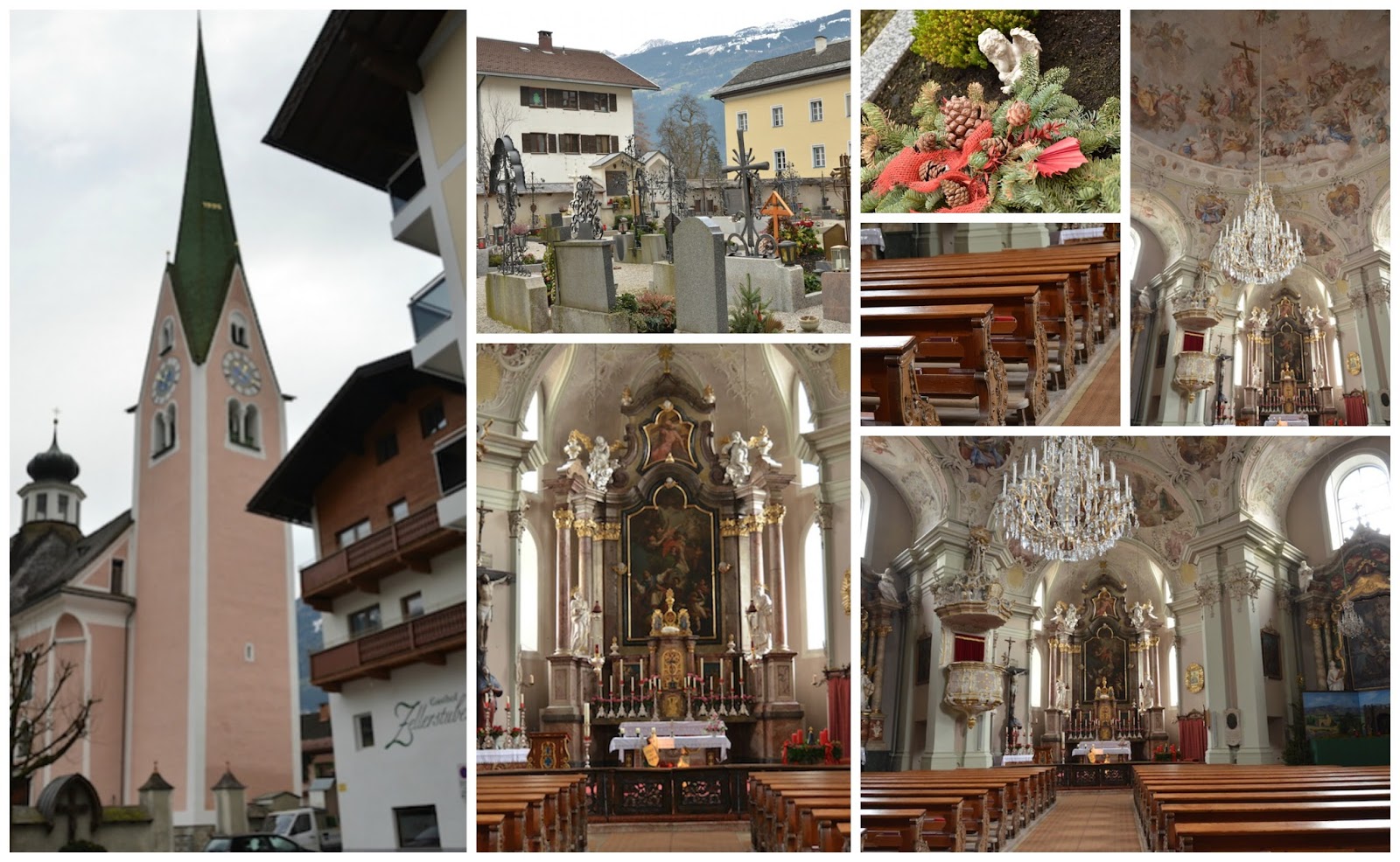 Continuamos hasta Zell am Ziller, una villa rural que también cuenta con importantes estaciones de esquí. Su iglesia, la Pfarrkirche, de color blanco y rosa, destaca sobre todo el pueblo y está rodeada de cruces ricamente decoradas.